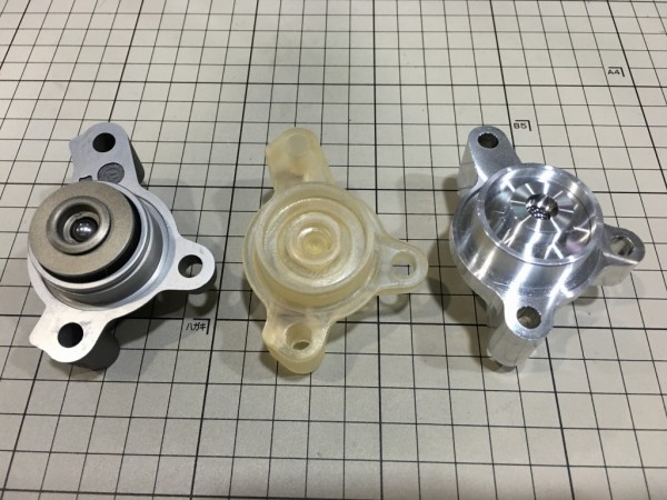 3つ並んでいますが、左が純正パーツ。真ん中が開発の為に3Dプリンタで作成したモックアップ。右がモックアップを元に実際にアルミで削り出した試作品です!