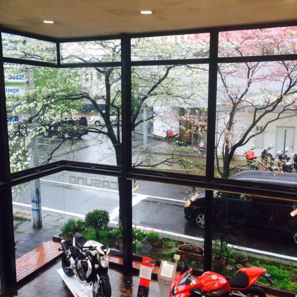 ショールーム前のハナミズキ、例年はGW頃に満開になりますが今年はちょっと早め。