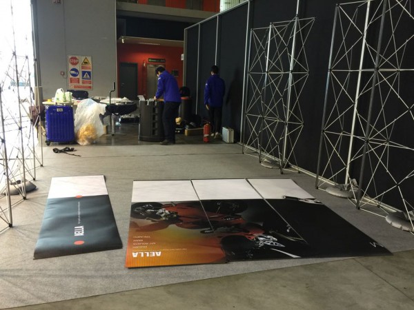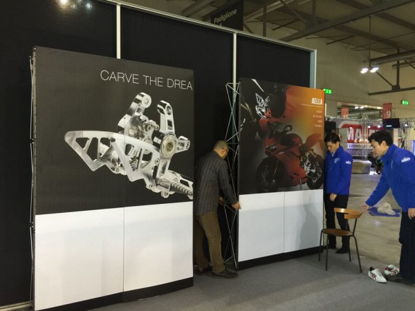 今回のEICMA用に作成された広告物を、フレームに装着していきます。