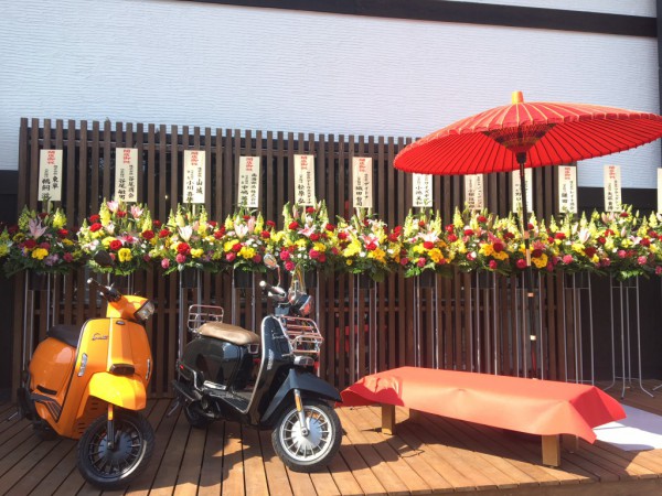 いかにも京都らしい野点傘と緋毛氈の縁台と、ランブレッタ。